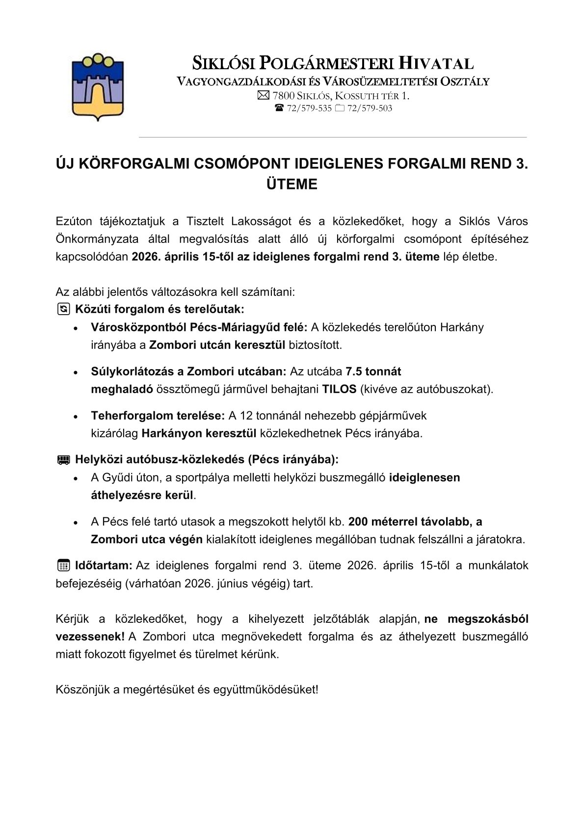 Ideiglenes forgalmi rend változás Siklóson (3. ütem)