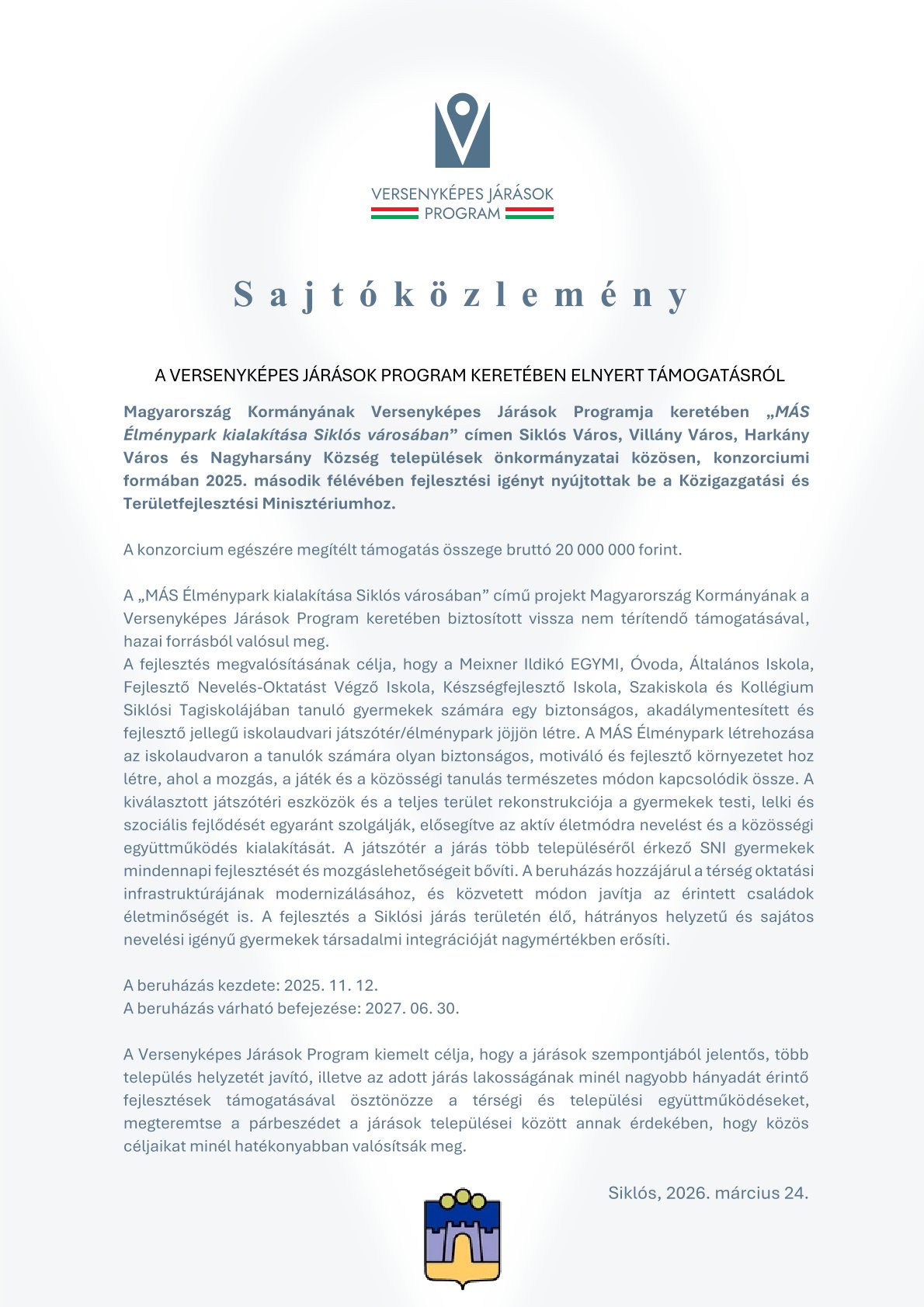Versenyképes Járások program II. - „MÁS Élménypark kialakítása Siklós városában”